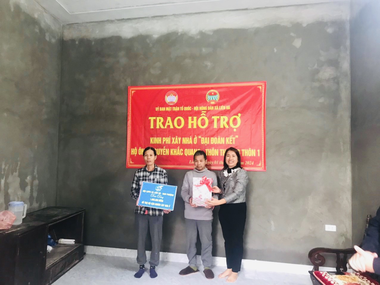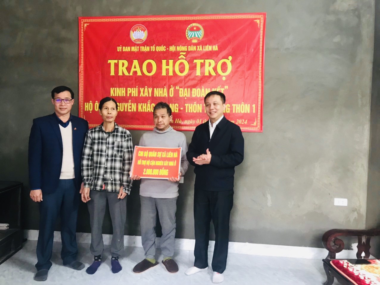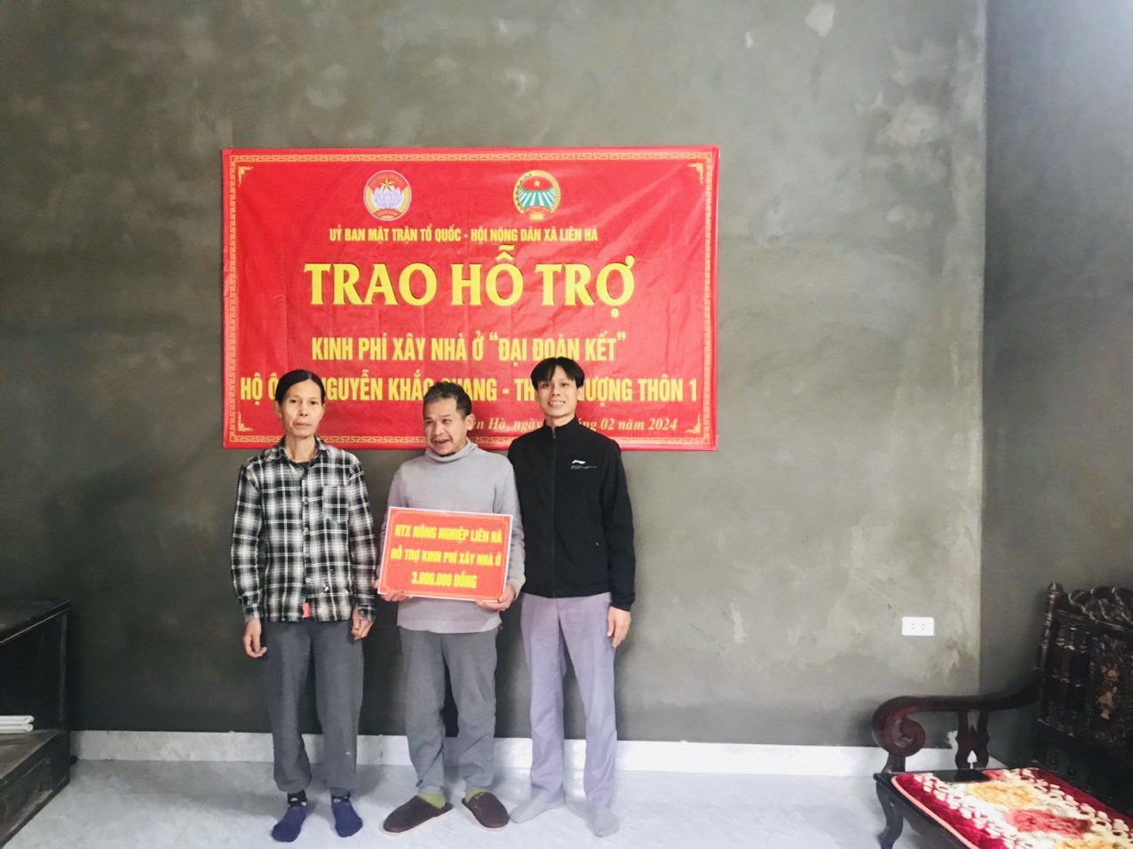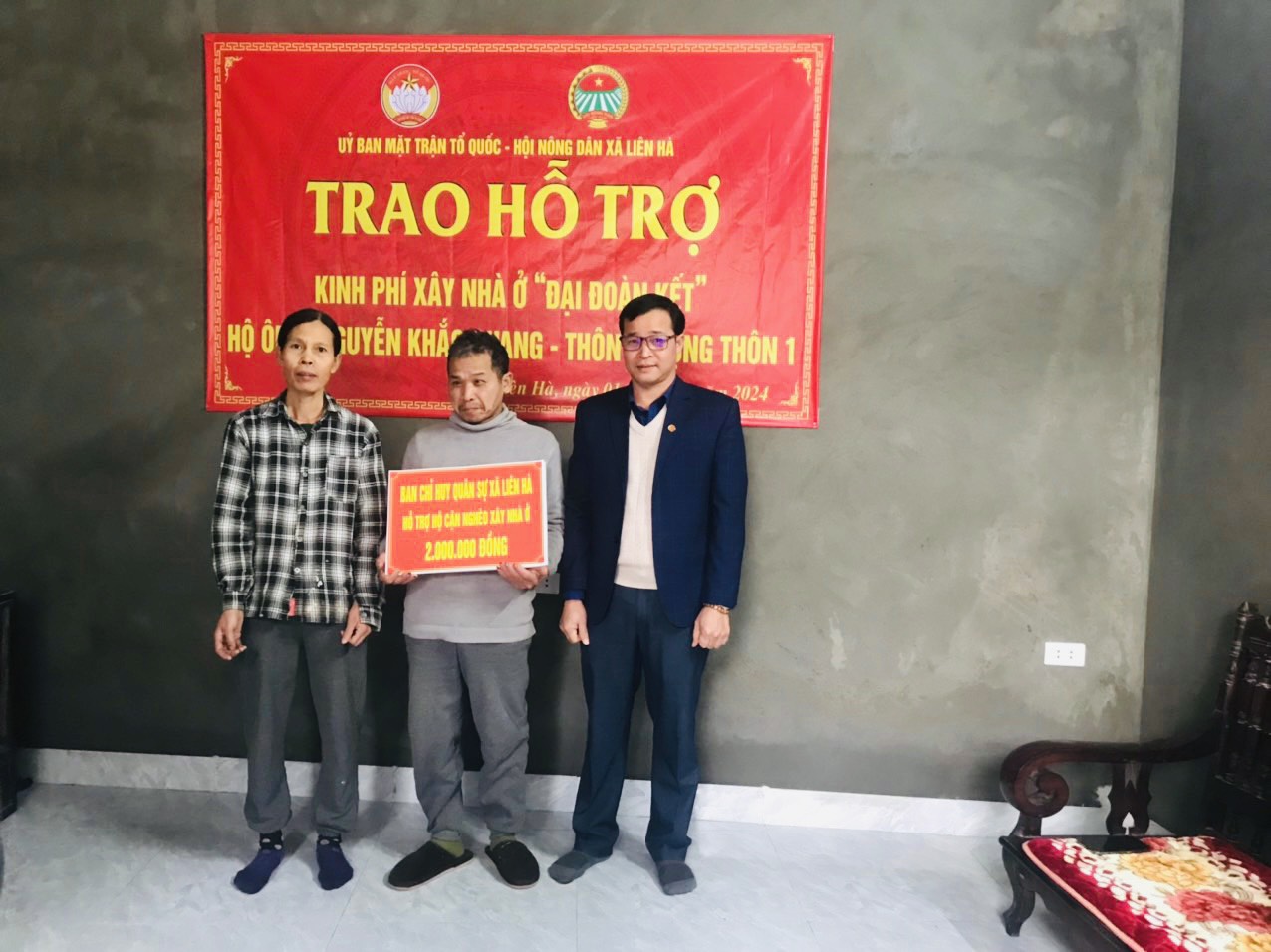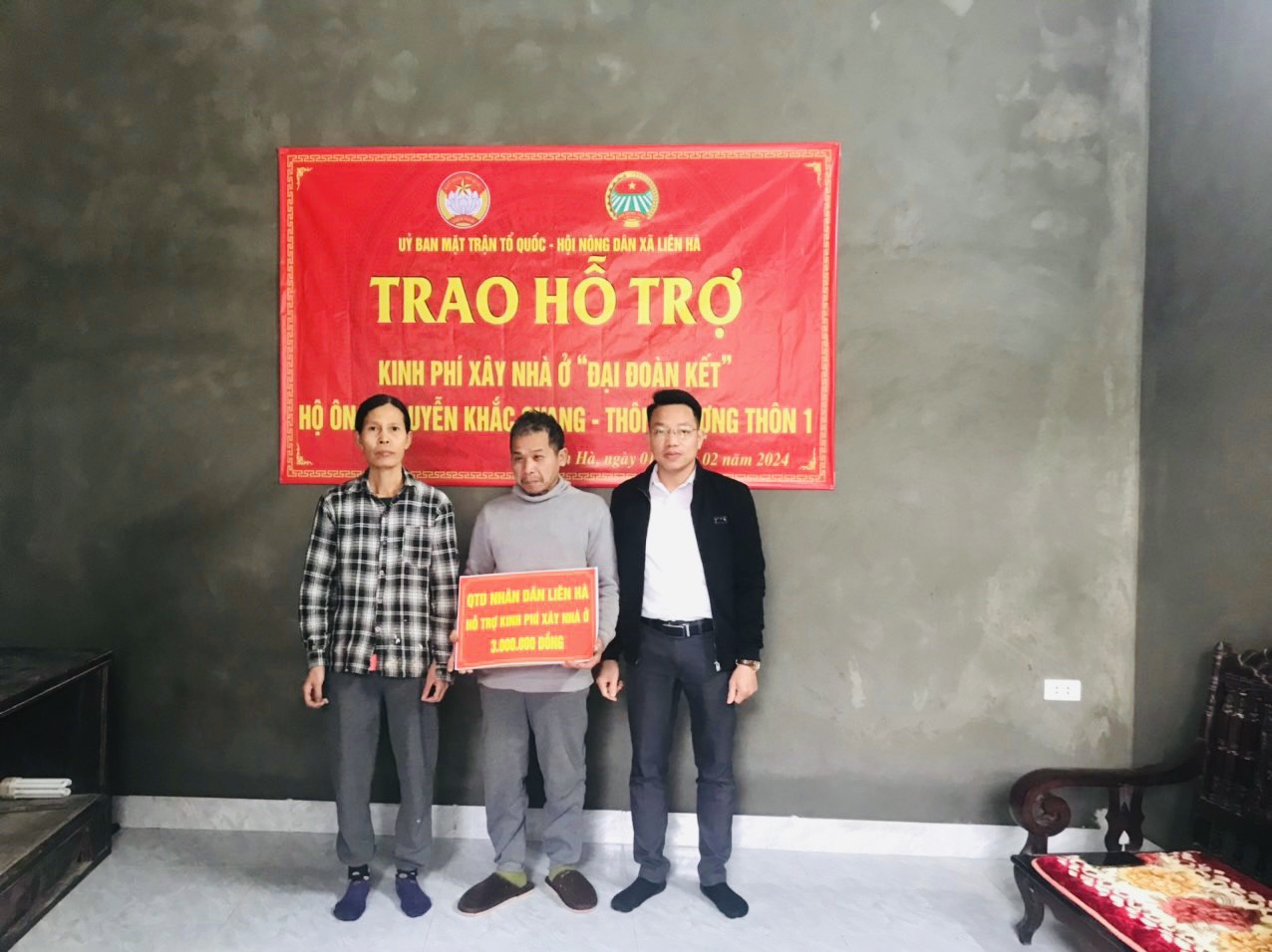 Ông Nguyễn Khắc Quang ở Thôn Thượng Thôn 01 xã Liên Hà là hộ cận nghèo của xã có hoàn cảnh gia đình rất khó khăn, thường xuyên ốm đau bệnh tật, nhà ở đã xuống cấp, gia đình không có khả năng xây dựng mới. Gia đình rất mong muốn xây dựng được ngôi nhà mới để ổn định cuộc sống. Sau một thời gian được hỗ trợ, giúp sức của gia đình, dòng họ đã hoàn thiện việc xây dựng một căn nhà mới. Tại buổi trao quà Ủy ban MTTQ Việt Nam xã đã trao hỗ trợ gia đình 20.000.000đ trích từ Quỹ "vì người nghèo của xã", Ngoài ra Uỷ ban MTTQ Việt Nam xã phối hợp với các ban, ngành đoàn thể xã, các tổ chức, đơn vị cùng chung tay hỗ trợ gia đình với số tiền 24.000.000đ; Tổng số tiền trao cho gia đình 44 triệu đồng. Phát biểu tại buổi trao quà, ông Nguyễn Nam Hà - Bí thư Đảng uỷ xã chúc mừng gia đình đã xây dựng được căn nhà mới, bớt đi lỗi lo hàng ngày mỗi khi trời nắng, trời mưa. Mong rằng gia đình sẽ vượt qua những khó khăn để vươn lên và ổn định cuộc sống. Gia đình rất phấn khởi và vui mừng vì đã xây dựng được căn nhà mới, gia đình cũng rất cảm động và cảm ơn sự quan tâm của các cấp, các ngành, Mặt trận tổ quốc, các tổ chức chính trị xã hội, các tổ chức, đơn vị đã giúp gia đình ông vượt qua những khó khăn để vươn lên trong cuộc sống.