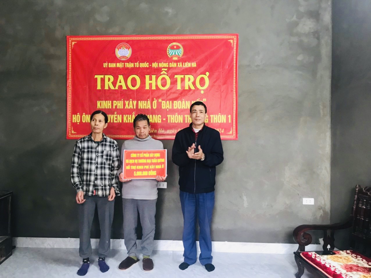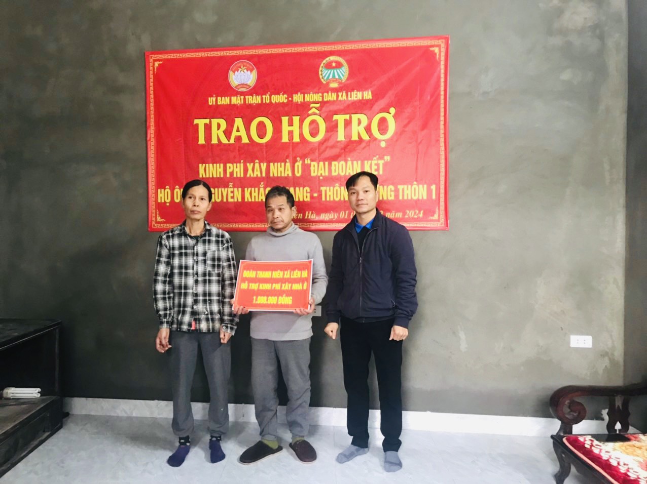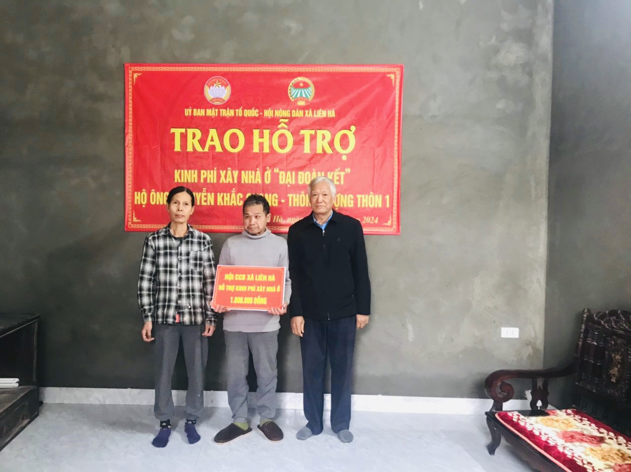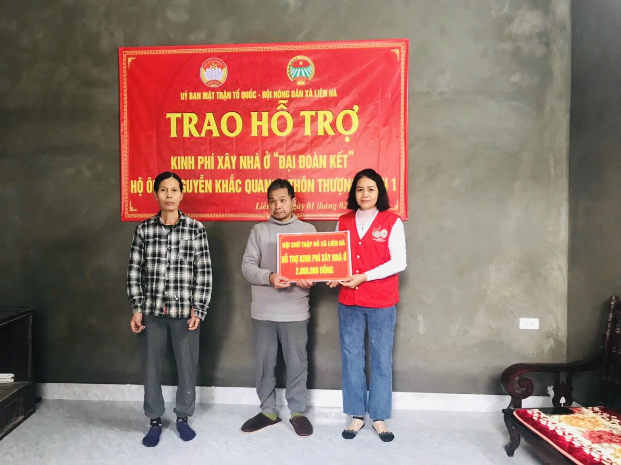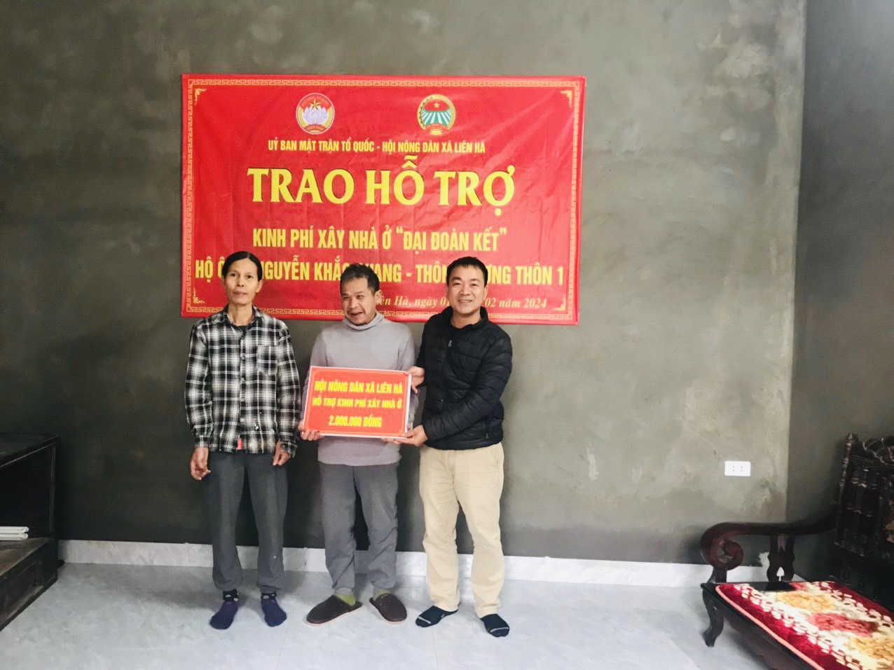 Ông Nguyễn Khắc Quang ở Thôn Thượng Thôn 01 xã Liên Hà là hộ cận nghèo của xã có hoàn cảnh gia đình rất khó khăn, thường xuyên ốm đau bệnh tật, nhà ở đã xuống cấp, gia đình không có khả năng xây dựng mới. Gia đình rất mong muốn xây dựng được ngôi nhà mới để ổn định cuộc sống. Sau một thời gian được hỗ trợ, giúp sức của gia đình, dòng họ đã hoàn thiện việc xây dựng một căn nhà mới. Tại buổi trao quà Ủy ban MTTQ Việt Nam xã đã trao hỗ trợ gia đình 20.000.000đ trích từ Quỹ "vì người nghèo của xã", Ngoài ra Uỷ ban MTTQ Việt Nam xã phối hợp với các ban, ngành đoàn thể xã, các tổ chức, đơn vị cùng chung tay hỗ trợ gia đình với số tiền 24.000.000đ; Tổng số tiền trao cho gia đình 44 triệu đồng. Phát biểu tại buổi trao quà, ông Nguyễn Nam Hà - Bí thư Đảng uỷ xã chúc mừng gia đình đã xây dựng được căn nhà mới, bớt đi lỗi lo hàng ngày mỗi khi trời nắng, trời mưa. Mong rằng gia đình sẽ vượt qua những khó khăn để vươn lên và ổn định cuộc sống. Gia đình rất phấn khởi và vui mừng vì đã xây dựng được căn nhà mới, gia đình cũng rất cảm động và cảm ơn sự quan tâm của các cấp, các ngành, Mặt trận tổ quốc, các tổ chức chính trị xã hội, các tổ chức, đơn vị đã giúp gia đình ông vượt qua những khó khăn để vươn lên trong cuộc sống.