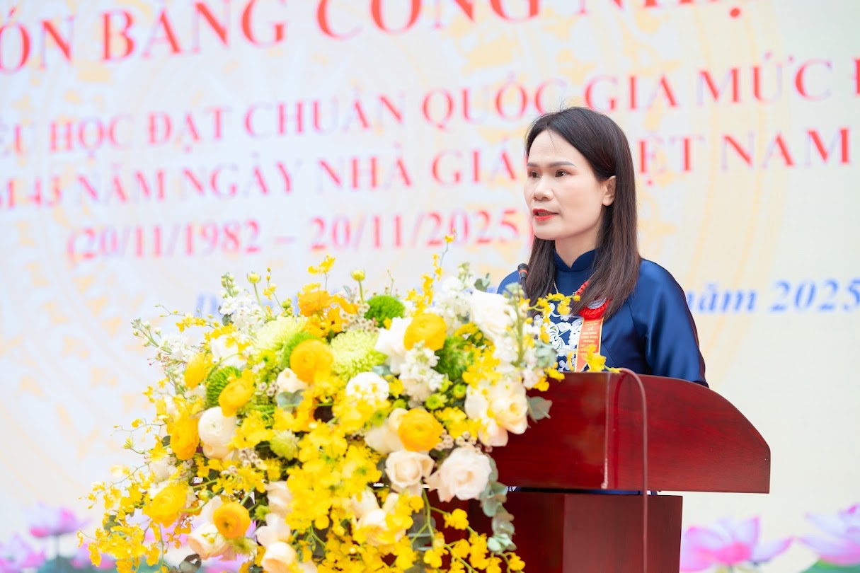 Đồng chí Nguyễn Thị Huệ, Bí thư chi hộ, Hiệu trưởng Nhà trường phát biểu tại buổi lễ
